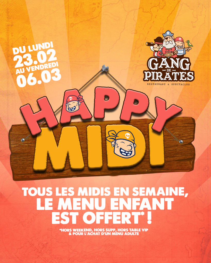 À l’occasion des vacances scolaires et comme nous sommes ouvert 7 jours sur 7 midis et soirs, du lundi 23.02 au vendredi 06.03, le Gang de Pirates lance l’offre « HAPPY MIDI » : Tous les midis en semaine, le menu enfant est OFFERT* !